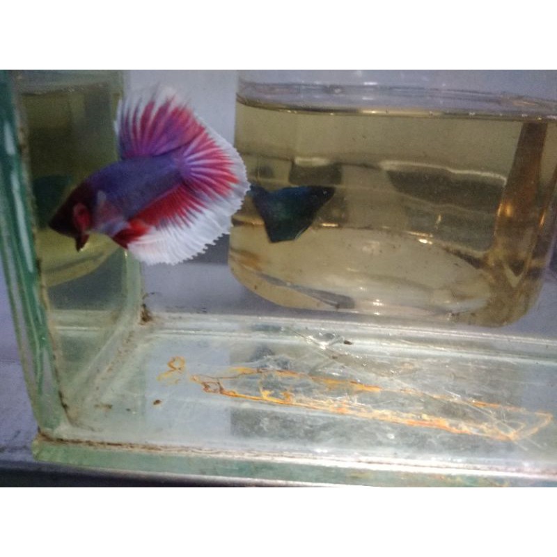 Alhamdulillah ikan nya udh nyampe, ga ada yg mati, cuma mau nge view aja yang satu jantan udh besar, nah yg satu betina msh burayak lagi ,, tapi gpp lahh topp markotoppp tokonya