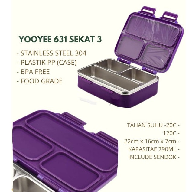 Lunch box terbaru dr yooyee dengan 3 sekat stainless.- Material: stainless 304, plastik food grade, BPA free, no odor- Tahan pada suhu -20°c sampai 120°c , no microwaveable- ukuran lunch box 22 cm x 16 cm x 7 cm- kapasitas 790 ml- dilengkapi dengan sendok semi