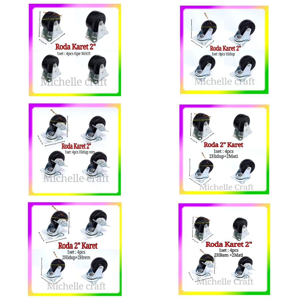 Roda Karet 2"Warna: HitamBahan: KaretUkuran: 2" (50mm)Tebal: 20mmTinggi Keseluruhan: 62mmUkuran Tapak : 6cm x 4,7cmTapak lubang : 4,5cm x 3,5cm-HIDUPTapak lubang : 4,5cm x 2,5cm-MATIHarga yang tertera untuk 1set : 4 pcs Beban 80kg/setSelamat Berbel