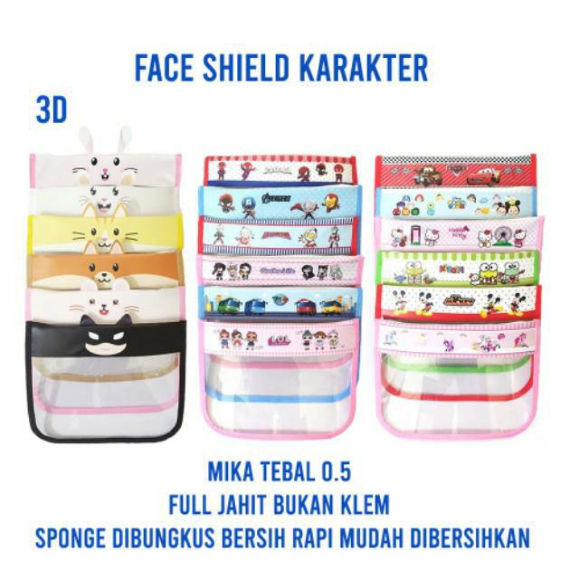 Face Shield KarakterUkuran untuk anak - dewasa. - Bahan synthetic printing (bukan karton atau plastik) - Mika Tebal 0,5mm- Bagian belakang busa di bungkus kain jadi bisa dicuci atau di lap dan busa tidak copot - Bisa custom tambah nama Rp 2.000 biaya
