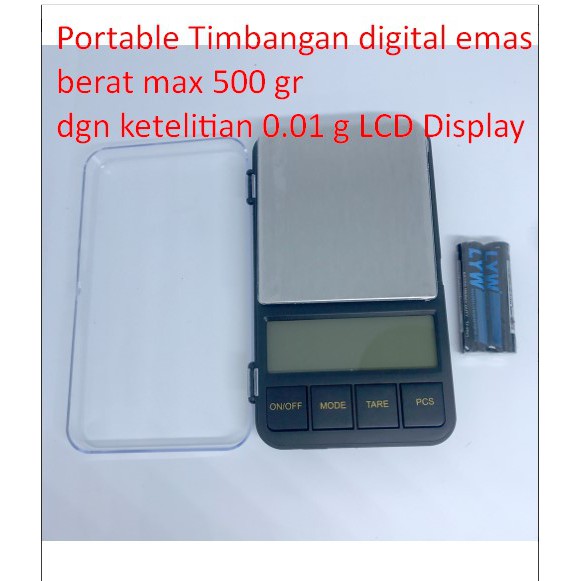Portable Timbangan digital emas berat max 500 gr dgn ketelitian 0.01 g LCD DisplayTimbangan elektronik ini cocok untuk menimbang berat spt emas perhiasan atau benda yang memerlukan perhitungan dengan keakuratan yang tinggiTerdapat fitur tare untuk menormalkan kemb
