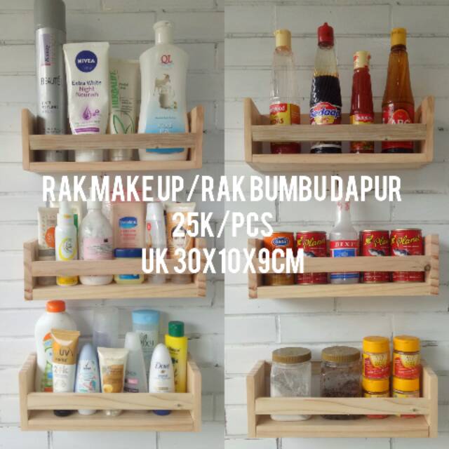 Rak untuk make up dan bumbu dapur agar penyimpanan tersusun rapihHarga per pcs yahBahan dari kayu jati belandaUkuran 30x10x9 cmpemasangan tinggal paku pada lubang yg sudah dised