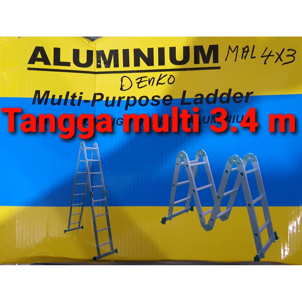 Tangga Multipurpose 12 Step 3,4 Meter Denko MAL 4x3Tangga Multipurpose / Multifungsi 3,4 Meter Merk Denko MAL -4x3Ladder / Tangga Multi Purpose adalah tangga yang sangat praktis dan multiguna untuk membantu proses pekerjaan yang membutuhkan alat untuk mencapai ketinggian. Ladder / Tangga Multi Purpose ini sangat serbaguna untuk kebutuhan rumah tangga anda sekalian. Ladder / Tangga Multi Purpose ini memiliki tinggi maksimal 3,4 meter dengan maksimal kapasitas 150 Kg. Ladder / tangga ini terbuat dari alumunium sehingga terjamin kekuatan produknya. Untuk spesifikasi detail ladder / tangga multi purpose ini dapat dilihat di gambar produk.Hati-hati dengan kwalitas tangga karena menyangkut keselamatan. Produk kami utamanya dibuat untuk pasar masyarakat Eropa. Karena itu telah bersertifikasi European Union Safety Standard, EN-131 dengan beban maximum 150 Kg lebih dari cukup untuk anda semua. Jangan keliru dengan tangan teleskopik kelas dibawahnya.Pembeli bijak dapat membedakan harga dan kwalitas.HAPPY SHOPINGSpesifikasi produk:- Bahan alumunium tebal 1.3 - 1.5 mm dan Anti karat- mudah dilipat sehingga tidak memakan banyak tempat- dapat ditekuk sesuai kebutuhan- dilipat / dipendekkan untuk 90 cm- diluruskan max 3.4 meter- dibentuk hurup A uk. 1.7 meter- dibentuk stagger