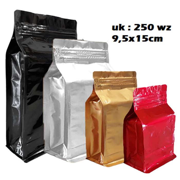 FLAT BOTTOM PADAT SUPER 250 WZ - VALVE 120GR KEMASAN KOPIharga diatas khusus untuk harga ukuran 250wzKemasan model Flat bottom (FB) dibandingkan dengan kemasan Pouch lebih mudah disusun FB dalam kardus, serta dibanding Gussette / guset kelebihan FB adalah bisa berdiri mantap bagus stabil serta ada ziplock samping yang memungkinkan kemasan setelah dibuka dapat dilock lagi. Tersedia warna :1. Gold2. Silver3. Red4. Blackhubungi kami untuk menanyakan ketersediaan.Model Side seal jadi perlu adanya sealer machine yang agak bagus yah jangan yang biasanya terlalu murah < 200.000 power nya kurang kuat ga bisa tembus kadang. (Resiko kemasan tebal)Dimensi : 95x150x60 ketebalan : 85 mikronBahan : PET / ALU / SPEDigunakan untuk mengemas produk kopi premium, jika untuk biji kopi muat pas ukuran 80-120 gram biji (tergantung jenis ukuran dan densitas biji kopinya), jika bubuk akan lebih banyak.Terima k