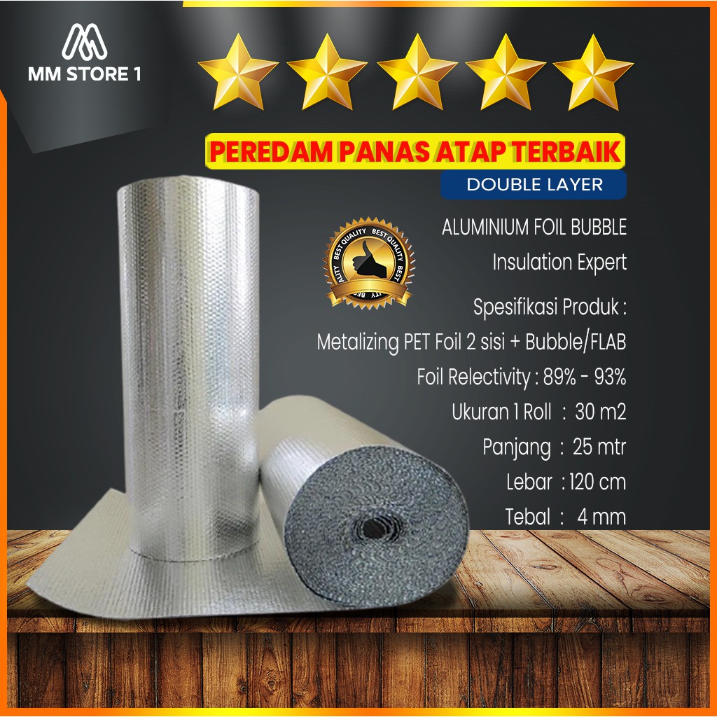 ALUMUNIUM FOIL BUBBLEMempertahankan suhu nyaman dengan mencegah terjadinya pertukaran suhu antar sisi, yaitu dari sisi bersuhu lebih tinggi menuju sisi bersuhu rendahFoil Laminated Air Bubble atau Bubble Foil adalah jenis Thermal Radiant Barrier yang efektif, dengan core base PE Air Bubble atau Bubble Wrap (air gap) yang dilaminasi reflective foil pada kedua sisi atas dan bawah.Core base air bubble terstruktur dari ribuan balon kenyal berisi udara dalam setiap m2,menghadirkan celah udara / air gap antar sisi reflective foil.FLAB atau Bubble Air mempunyai performa lebih baik dibanding produk sejenis dari kompetitor, karena :1. Reflectivity Foil Bubble lebih baik. Reflectivity Foil memantulkan panas lebih banyak (Reflectivity 97%) dan meneruskan panas lebih sedikit (Emissivity 0.04) ke lapisan selanjutnya.2. Kantong Udara dan Air-gap besar. Bubble Air mempunyai struktur dengan kantong udara terbesar dan celah air-gap terlebar dibanding produk air-bubble sejenis.3. Bahan struktur awet, ringan dan kuat. FLAB mempergunakan bahan baku LDPE virgin yang kuat, alot, kenyal tidak mudah pecah / kempes namun ringan.FLAB mempunyai berat produk dengan rasio ideal sehingga mendapatkan kekuatan struktur terbaik dengan konduktivitas panas terendah.Fungsi Produk :+ Meredam panas atap maupun tembok bangunan+ Meredam suara+ Menahan lembab+ Menahan tampias bocor+ Meminimalisir pancaran radiasi yang masuk ke suatu gedung/bangunanSpesifikasi :+ Metalizing PET Foil 2 sisi + Bubble/FLAB+ Foil Relectivity : 89% - 93%+ Ukuran 1 Roll: 30 m2 - Panjang: 25 mtr - Lebar: 120 cm - Tebal: 4 mmTIPS PEMASANGAN :+ Sebelum dan selama pemasangan jaga supaya Aluminium Foil Bubble dalam keadaan kering.+ Pasang Aluminium Foil Bubble di bawah atap dengan celah minimal 40mm, agar lapisan pemantul panas dapat berfungsi optimal.+ Jarak minimal overlap antar lapisan gelaran adalah 15mm, lapisan gelaran yg lebih tinggi menutupi overlap lapisan gelaran yg di bawah.+ Perhatikan gelaran lapisan, jangan sampai terjadi kantong air.+ Hindari jalur kabel/kawat listrik terbuka tanpa lapisan. Foil berbahan dasar alumunium merupakan konduktor (penghantar) listrik.Ukuran 1 Roll: 30 m2- Panjang: 25 mtr- Lebar: 120 cmDisarankan pilih ekspedisi JNT, Sicepat , Ninja Express Kalau Anteraja dan JNE JTR ongkir dihitung dari ukuran dimensi akan terkena tambahan ongkir.dan kemungkinan akan ditolak oleh ekspedisinya. #aluminiumfoil #insulasiatap #peredampanas #alumuniumfoilwoven #