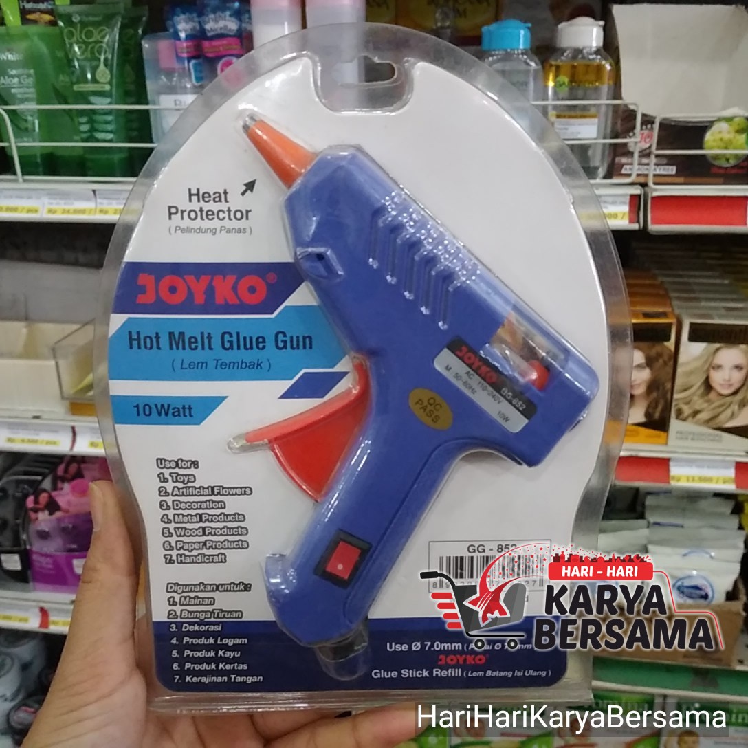 JOYKO HOT MELT GLUE GUN LEM TEMBAK 10 WATT GG-852JOYKO HOT MELT GLUE GUN LEM TEMBAK 10 WATT GG-852 merupakan lem tembak berbahanberkualitas yang digunakan untuk membakar atau melelehkan lem. Didesain ringandan simple. Dapat di isi dengan lem batang dengan 7 mm. Memiliki daya 10 watt.Terdapat saklat ON - Off. Produk ini sangat cocok untuk perlengkapan rumahtangga, kantor, ataupun industri. Bisa digunakan untuk merekatkan berbagai jenisproduk, dari kertas, karton, kayu, plastik, mainan anak, dan lain sebagainya. * Dilengkapi dengan Heat Protector (Pelindung Panas) * Saklar On/Off * Daya : 10 Watt * Voltase : 220-240 V * Frekuensi : 50-60 Hz * Isi lem batang : 7.0 mmFitur Produk * Lem tembak * Daya 10 watt * Terdapat saklar ON - Off * Dapat diisi dengan lem batang berdiameter 7 mm * Handy size, ringan dan s